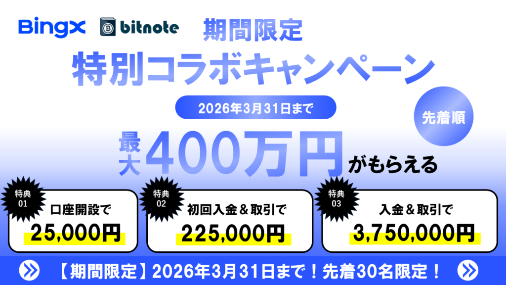当サイトのリンクからBingXに登録すると、最大400万円の限定特典を受け取ることができます。