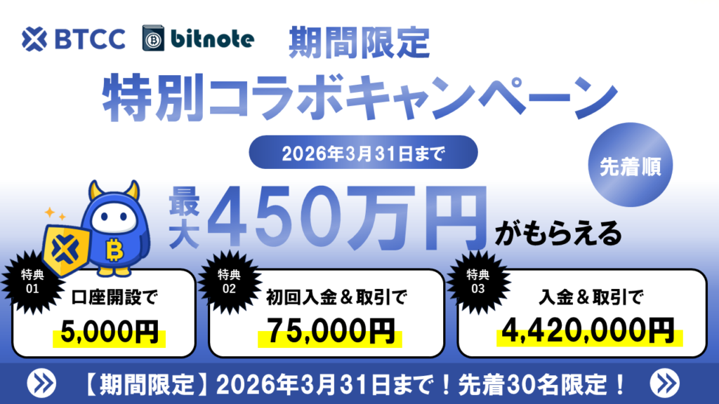 ただし、コラボキャンペーンは2026年3月31日までの期間限定であり、先着順のため、お得に仮想通貨取引を始めたい方は、それまでにBTCCの口座開設をしておきましょう!