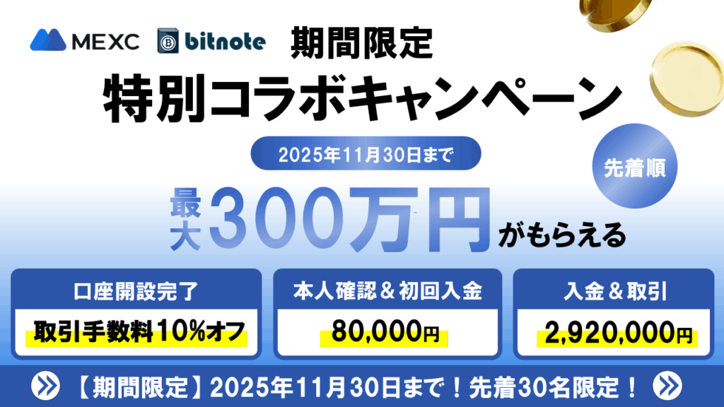 ただし、コラボキャンペーンは2025年11月30日までの期間限定であり、先着順のため、お得に仮想通貨取引を始めたい方は、それまでにBitgetの口座開設をしておきましょう!