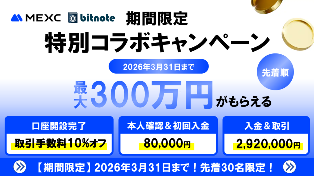当サイトのリンクからMEXCの口座開設をすると、通常の特典に加えて最大2万ドル(300万円)の限定特典を受け取ることができます。